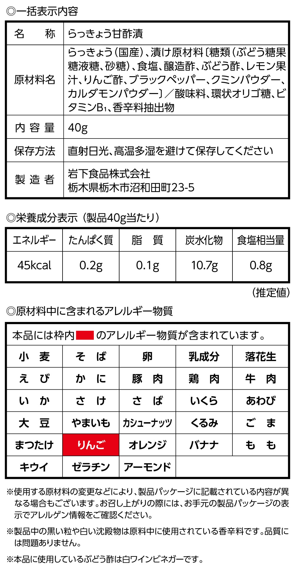 ほどよい甘さとバランスのよい酸味、3種のスパイス香るキレのある余韻。国産らっきょう使用。